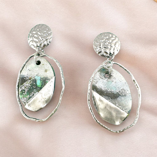 Handmade modern geometric earrings crafted from polymer clay with silver, grey, and green accents. Featuring stainless steel posts and textured me...