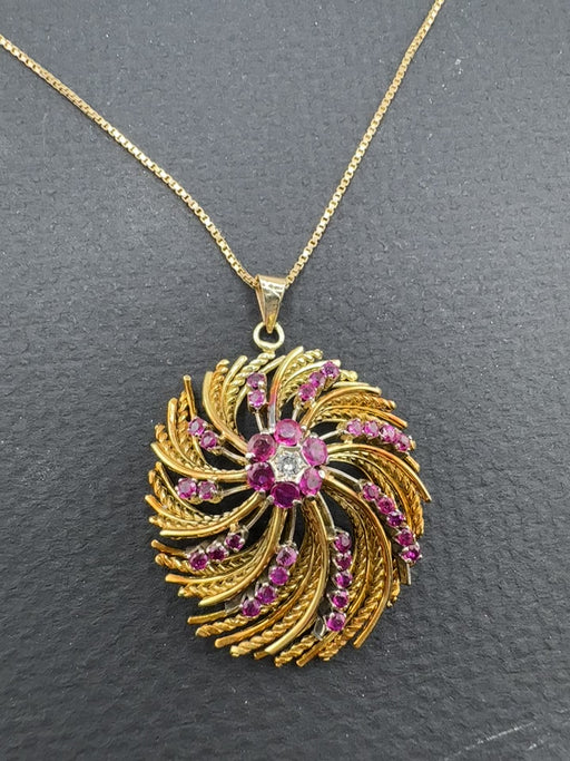 18K Italian Gold Ruby & Diamond Swirl Pendant Necklace – July Birthstone 19.52g