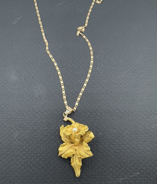18K Gold Yellow Matt Orchid Necklace with Pearl Pendant | 1.7” Pendant, 14K 18” Chain | 8.90g