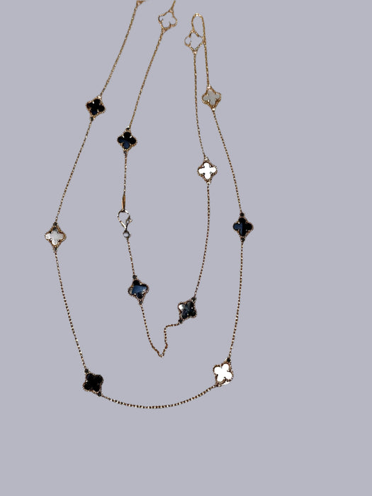 18k Gold Clover Necklace With Mother of Pearl and Onyx , 13 Motifs 32in Necklace